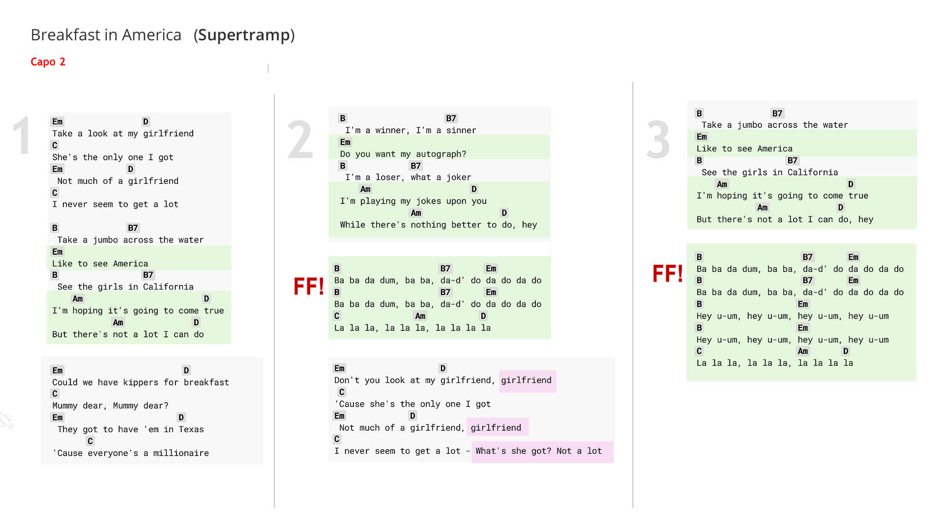 Breakfast in america (Supertramp): Take a look at my girlfriend She's the only one I got Not much of a girlfriend I've never seem to get a lot Take a jumbo across the water Like to see America See the girls in California I'm hopin', it's going to come true But there's not a lot, I can do Could we have kippers for breakfast Mummy dear, Mummy dear They got to have 'em in Texas 'Cos everyone's a millionaire I'm a winner, I'm a sinner Do you want my autograph I'm a loser, what a joker I'm playing my jokes upon you While there's nothin' better to do Hey Papararam pano daram no no no Papararam pano daram no no no Na na na nana na na na Don't you look at my girlfriend (Girlfriend) She's the only one I got Not much of a girlfriend (Girlfriend) I've never seem to get a lot (What she got in another land) Take a jumbo cross the water Like to see America See the girls in California I'm hoping it's going to come true But there's not a lot I can do Hey Papararam pano daram no no no Papararam pano daram no no no Hey aham Hey aham Hey aham Hey aham Hey aham Hey aham Hey aham Hey aham Na na na nana na na na