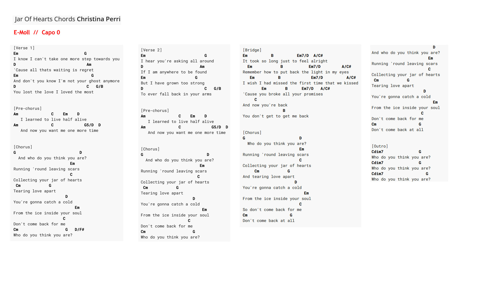 Jar of hearts (Christina Perri): I know I can't take one more step towards you 'Cause all that's waiting is regret Don't you know I'm not your ghost anymore You lost the love I loved the most I learned to live half alive Now you want me one more time Who do you think you are? Runnin' 'round leaving scars Collecting your jar of hearts Tearing love apart You're gonna catch a cold From the ice inside your soul So don't come back for me Who do you think you are? I hear you're asking all around If I am anywhere to be found But I have grown too strong To ever fall back in your arms I've learned to live half alive Now you want me one more time Who do you think you are? Runnin' 'round leaving scars Collecting your jar of hearts Tearing love apart You're gonna catch a cold From the ice inside your soul So don't come back for me Who do you think you are? It took so long just to feel alright Remember how to put back the light in my eyes I wish I had missed the first time that we kissed 'Cause you broke all your promises And now you're back You don't get to get me back Who do you think you are? Runnin' 'round leaving scars Collecting your jar of hearts Tearing love apart You're gonna catch a cold From the ice inside your soul So don't come back for me Don't come back at all Who do you think you are? Runnin' 'round leaving scars Collecting your jar of hearts Tearing love apart You're gonna catch a cold From the ice inside your soul Don't come back for me Don't come back at all Who do you think you are? Who do you think you are? Who do you think you are?
