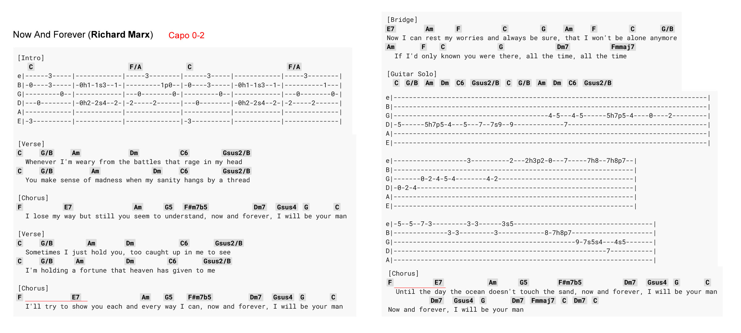Now And Forever (Richard Marx): Whenever I'm weary From the battles that rage in my head You make sense of madness When my sanity hangs by a thread I lose my way, but still you Seem to understand Now and forever I will be your man Sometimes I just hold you Too caught up in me to see I'm holding a fortune That Heaven has given to me I'll try to show you Each and every way I can Now and forever I will be your man Now, I can rest my worries And always be sure That I won't be alone, anymore If I'd only known you were there All the time All this time! Until the day the ocean Doesn't touch the sand Now and forever I will be your man Now and forever I will be your man
