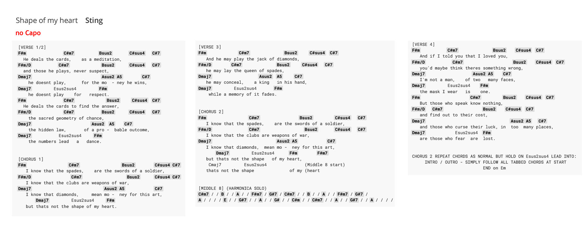 Shape of my heart (Sting): He deals the cards as a meditation And those he plays never suspect He doesn't play for the money he wins He don't play for respect He deals the cards to find the answer The sacred geometry of chance The hidden law of a probable outcome The numbers lead a dance I know that the spades are the swords of a soldier I know that the clubs are weapons of war I know that diamonds mean money for this art But that's not the shape of my heart He may play the jack of diamonds He may lay the queen of spades He may conceal a king in his hand While the memory of it fades I know that the spades are the swords of a soldier I know that the clubs are weapons of war I know that diamonds mean money for this art But that's not the shape of my heart That's not the shape The shape of my heart If I told her that I loved you You'd maybe think there's something wrong I'm not a man of too many faces The mask I wear is one But those who speak know nothing And find out to their cost Like those who curse their luck in too many places And those who fear are lost I know that the spades are the swords of a soldier I know that the clubs are weapons of war I know that diamonds mean money for this art But that's not the shape of my heart That's not the shape of my heart That's not the shape The shape of my heart