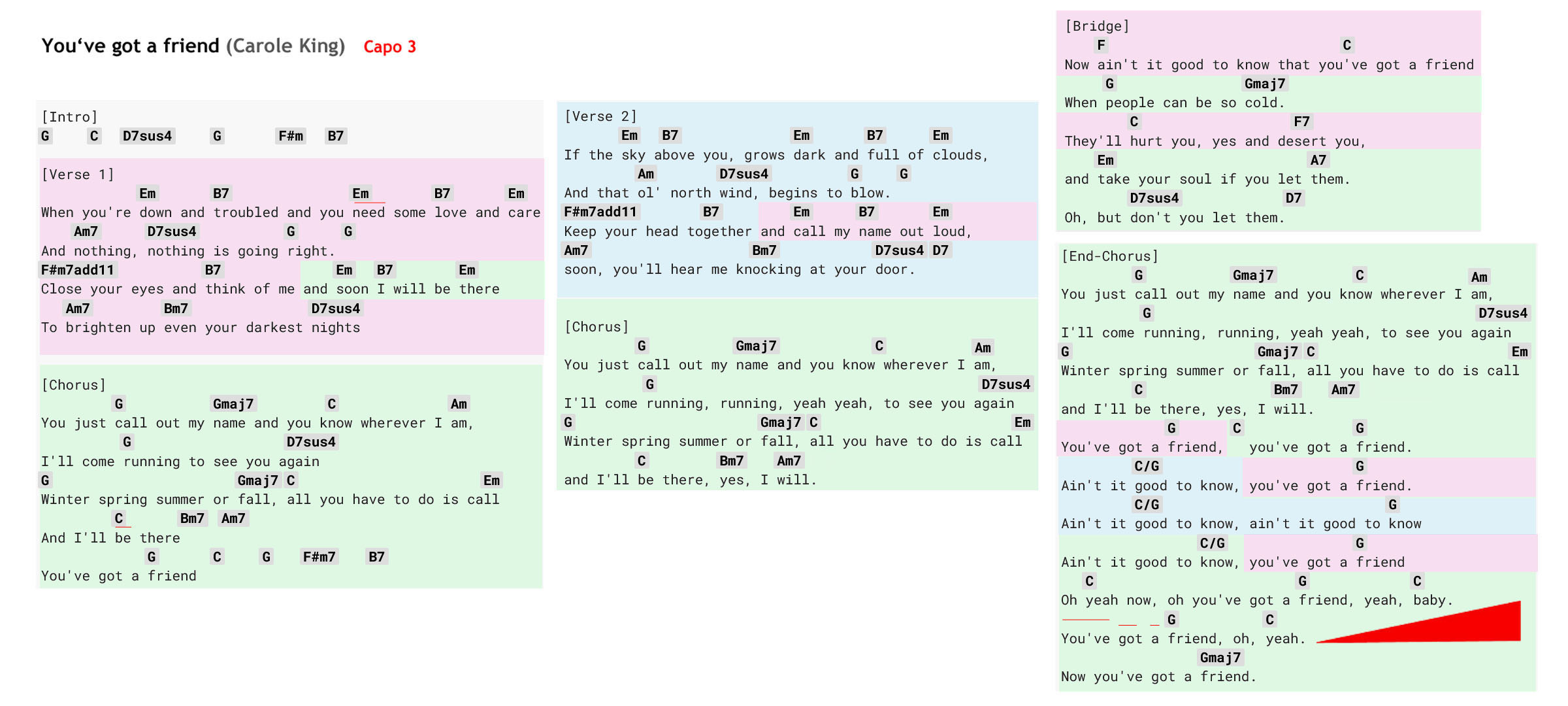 You've got a friend (Carole King): When you're down and troubled And you need a helping hand And nothing, oh, nothing is going right Close your eyes and think of me And soon I will be there To brighten up even your darkest nights … You just call out my name And you know wherever I am I'll come running, oh, yeah, baby To see you again Winter, spring, summer or fall All you've got to do is call And I'll be there, yeah, yeah, yeah You've got a friend … If the sky above you Should turn dark and full of clouds And that old north wind should begin to blow Keep your head together And call my name out loud now Soon I'll be knocking upon your door … You just call out my name And you know wherever I am I'll come running, oh, yes, I will To see you again Winter, spring, summer or fall, yeah All you've got to do is call And I'll be there, yeah, yeah, yeah … Hey, ain't it good to know that you've got a friend? When people can be so cold They'll hurt you and desert you Well, they'll take your soul if you let them Oh, yeah, but don't you let them … You just call out my name And, you know, wherever I am I'll come running to see you again Oh, baby don't you know 'bout Winter, spring, summer or fall Hey, now, all you've got to do is call Lord, I'll be there, yes, I will You've got a friend … You've got a friend, yeah Ain't it good to know you've got a friend? Ain't it good to know you've got a friend? Oh, yeah, yeah, you've got a friend